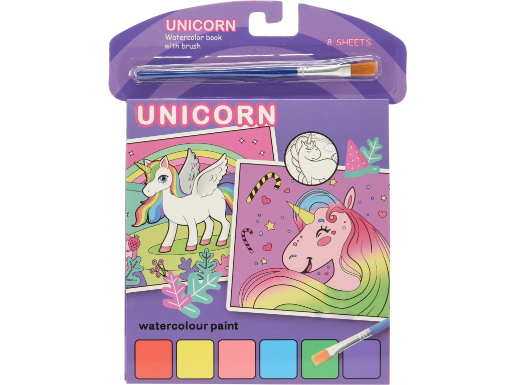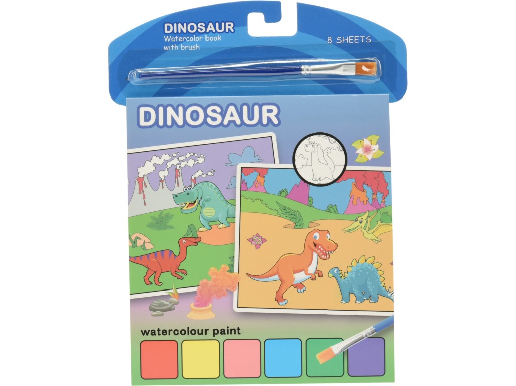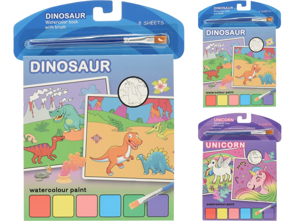 8 db-os, 160x200 mm-es gyermek kifestőkönyv készlet, 6 db akvarellfestékkel és 1 ecsettel/unikornis, dinoszauruszos keverék, színes