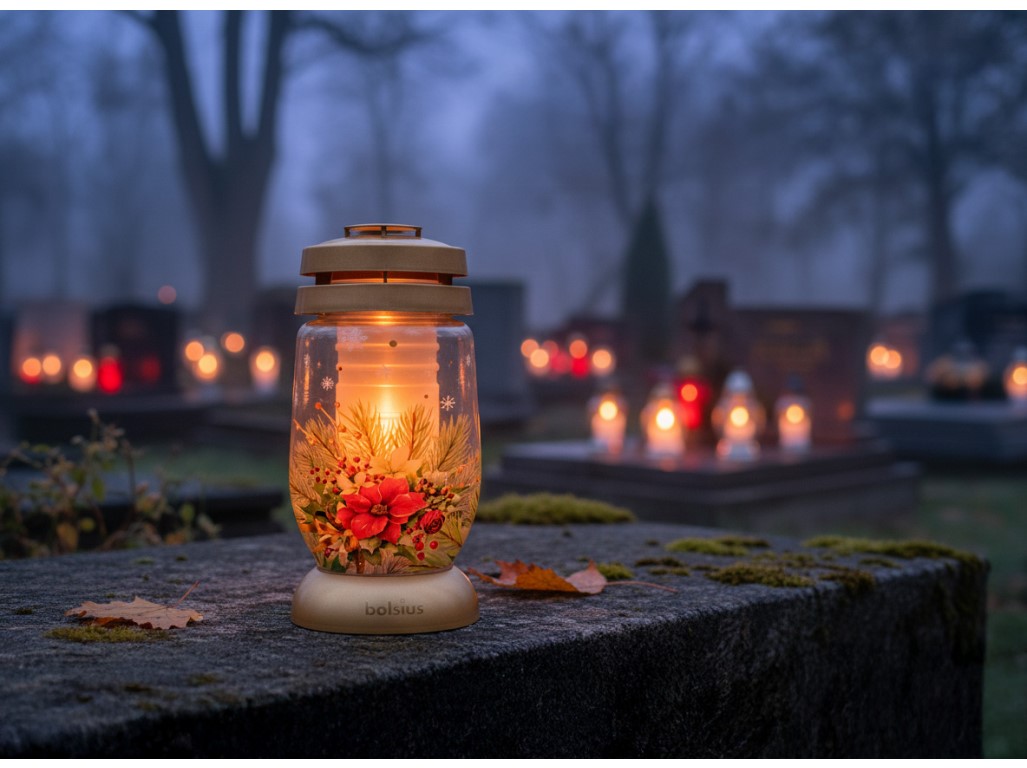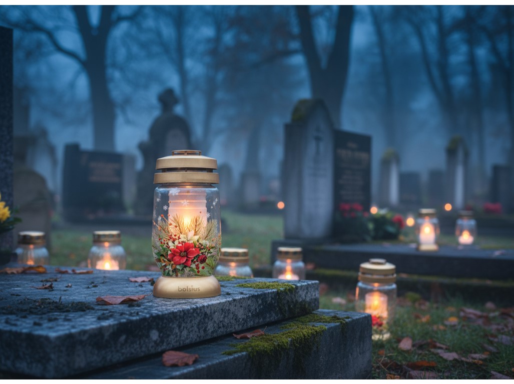 Bolsius temetői mécses téli motívummal és betéttel - akár 36 órán át tartó emlékek lángja.