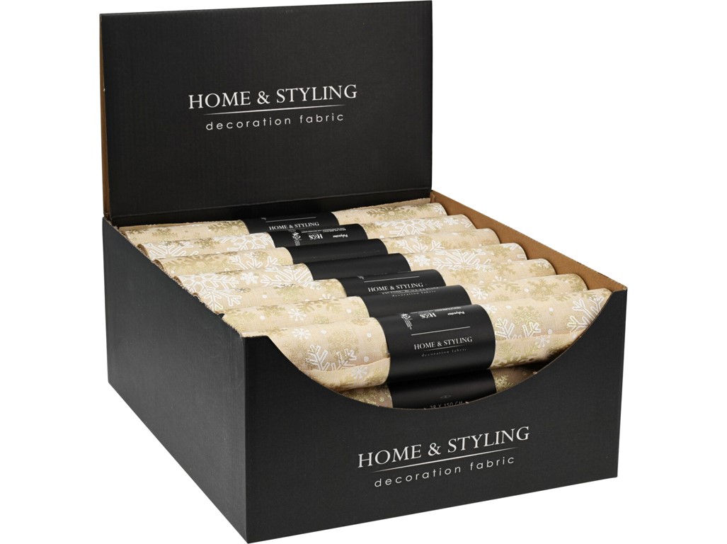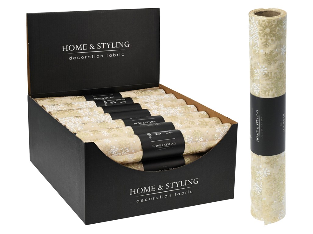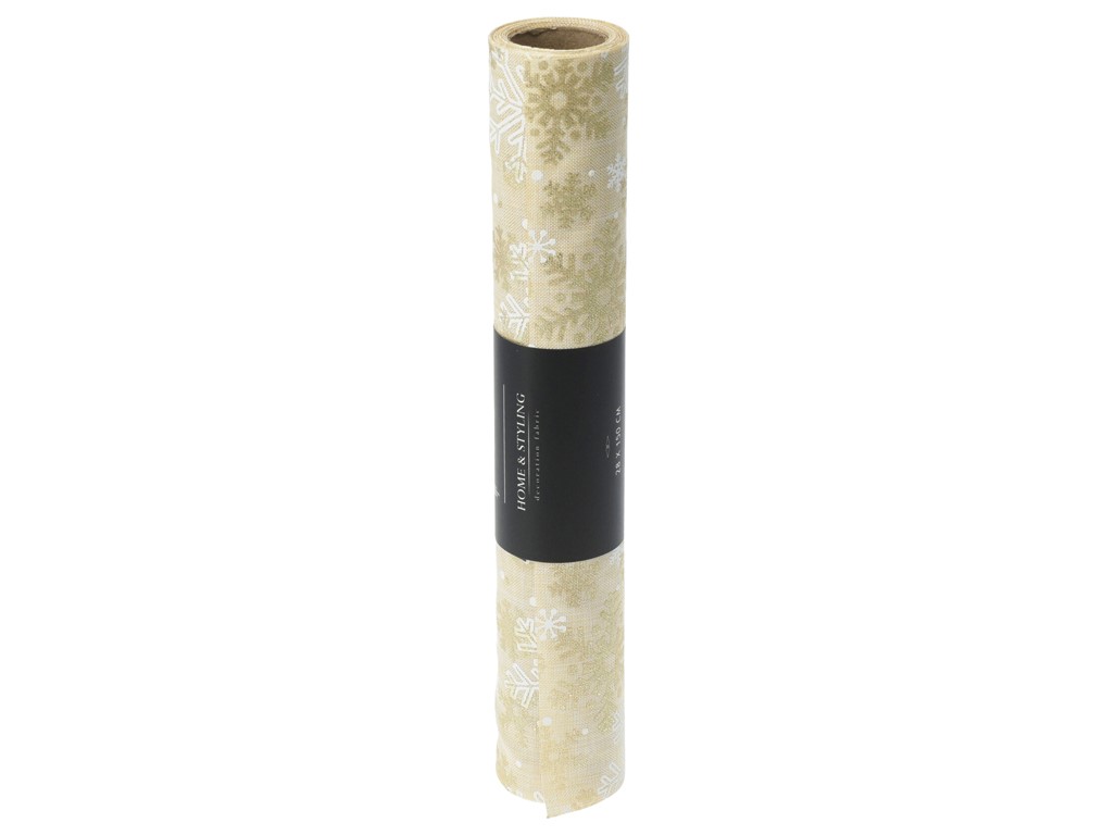 Dekoratív poliészter szövet 2500x280mm tekercs hópehely mintával, arany, fehér, pezsgőszínű
