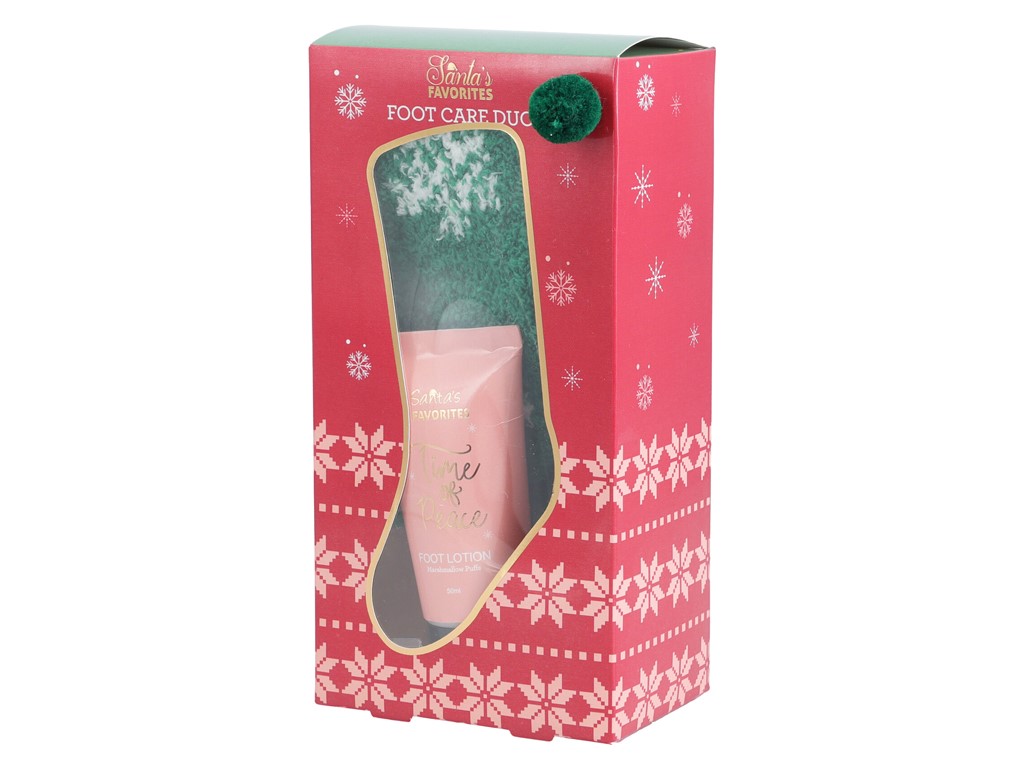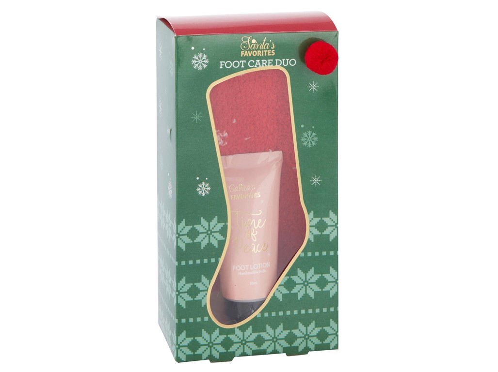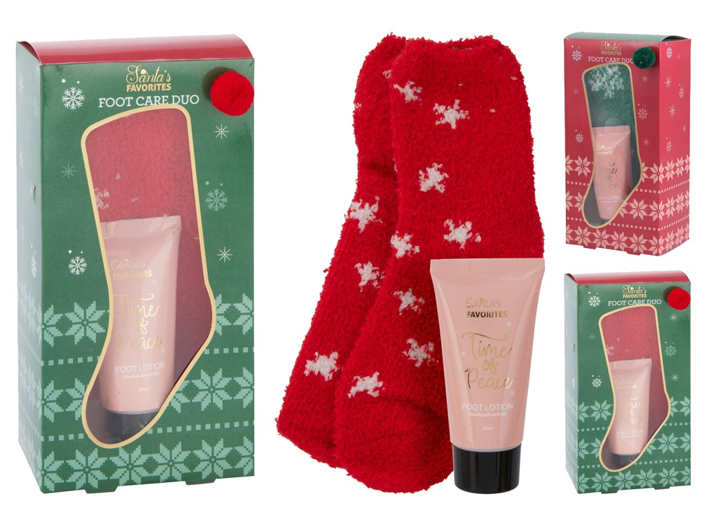 A lábápolási ajándékszett tápláló folyékony krémet (50 ml) és puha zoknikat tartalmaz vegyes színekben. Remek ajándék a kényelemért és a gondoskodásért.