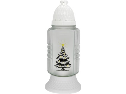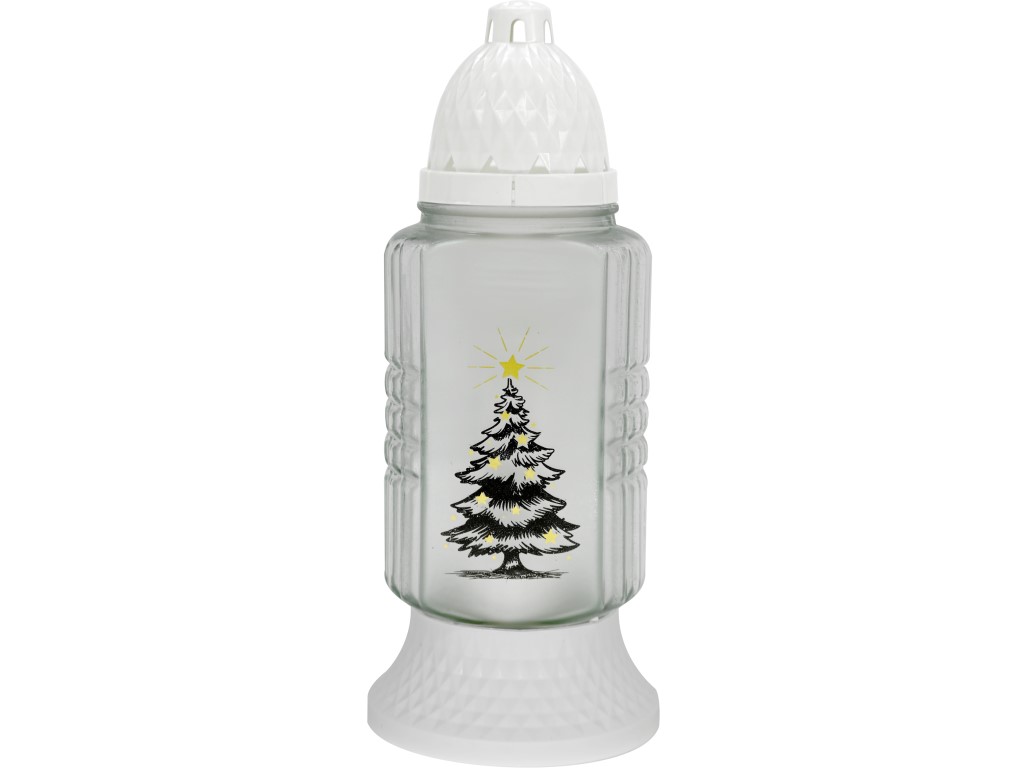 Madona temetői lámpás karácsonyfa motívummal, 27 cm magas. A lámpás 80 g-os betéttel rendelkezik, amely körülbelül 24 órán át ég. Ideális választás kegyeleti díszítéshez.