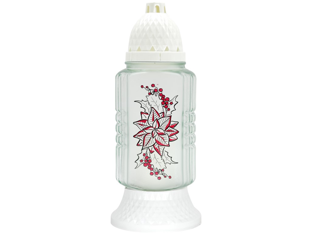 Madona temetői lámpás karácsonyi csillag motívummal, 27 cm magas. A lámpás 80 g-os betéttel rendelkezik, amely körülbelül 24 órán át ég. Ideális választás kegyeleti díszítéshez.