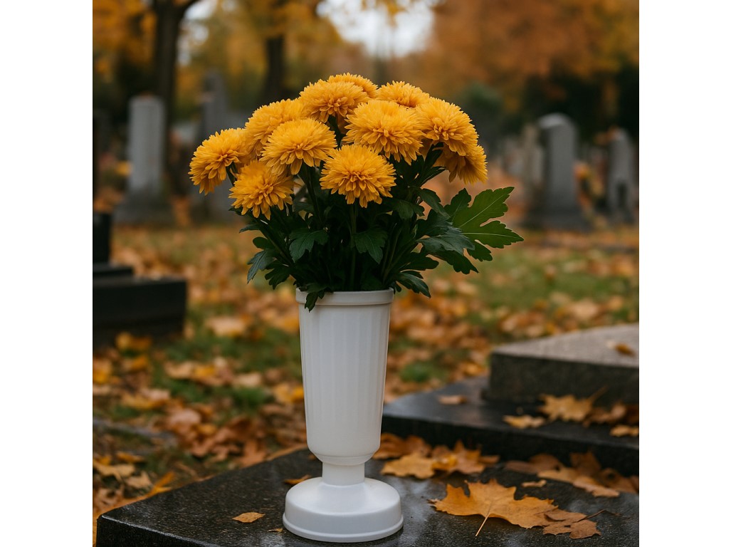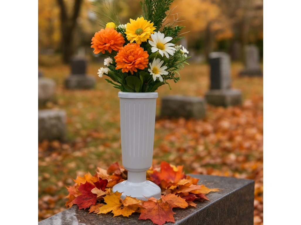 A 30 cm súlyú műanyag Madonna temetőváza ideális megoldás a virágok biztonságos és stabil sírra helyezésére. A masszív súlynak köszönhetően a váza ellenáll a szélnek, és biztosítja, hogy a virágok hosszú ideig egyenesen álljanak. Az egyszínű kialakít