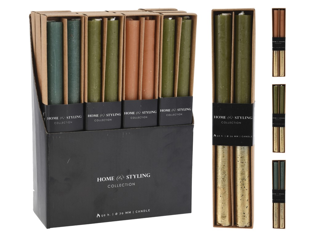 A rusztikus, kúpos gyertyák finom fémes csillogással ünnepi hangulatot varázsolnak bármilyen enteriőrbe. A csomag 2 db hosszúkás, 21x250 mm-es gyertyát tartalmaz. Klasszikus gyertyatartókhoz, ünnepi asztalra vagy ajándékcsomag részeként is alkalmasak. Elegáns színek keveréke.