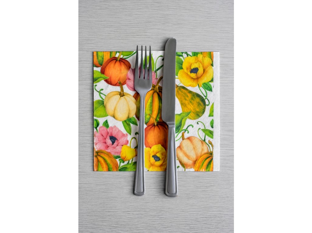 Stílusos szalvéták lágy tök- és mákmintával, ünnepi és hétköznapi őszi asztalhoz egyaránt. A csomag 20 db, háromrétegű, 33 × 33 cm méretű szalvétát tartalmaz.