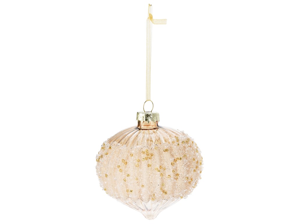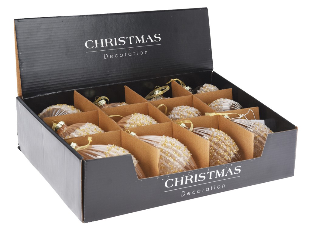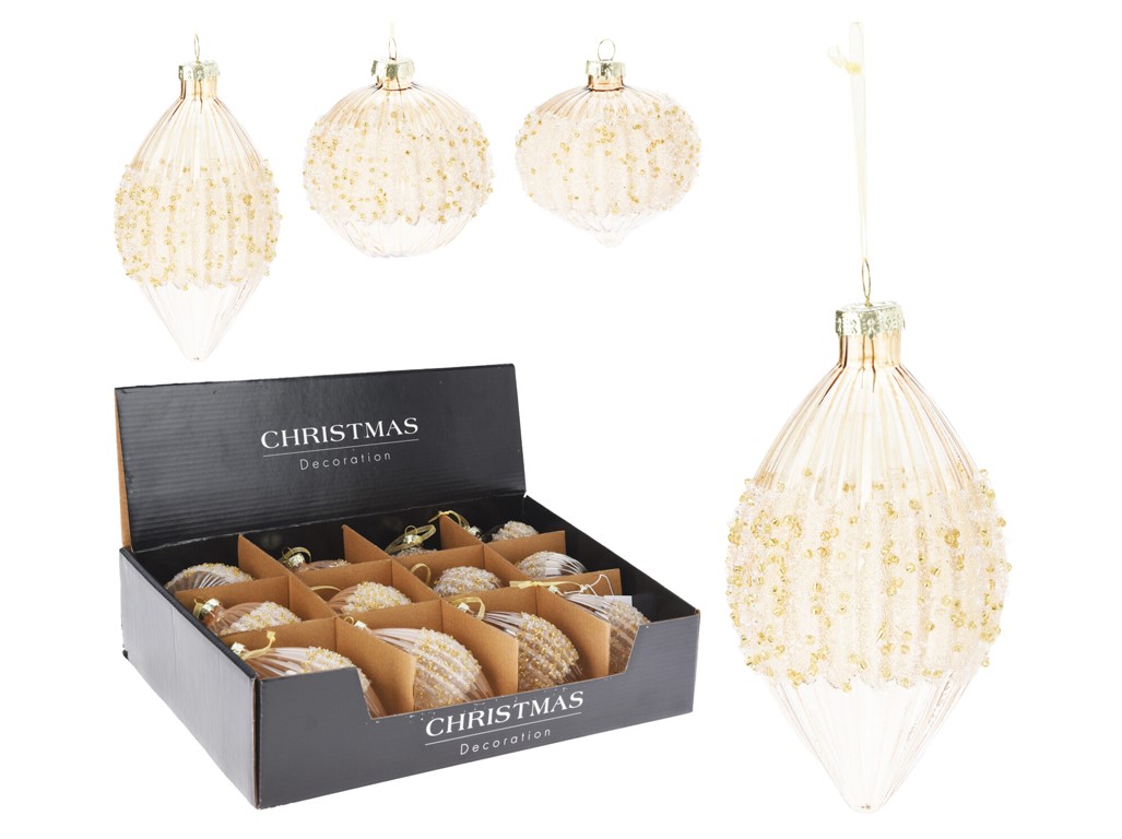 Üveggömbok 80/80/120mm fára, különböző formák díszítéssel és arany gyöngyök mix, sárga, rózsaszín