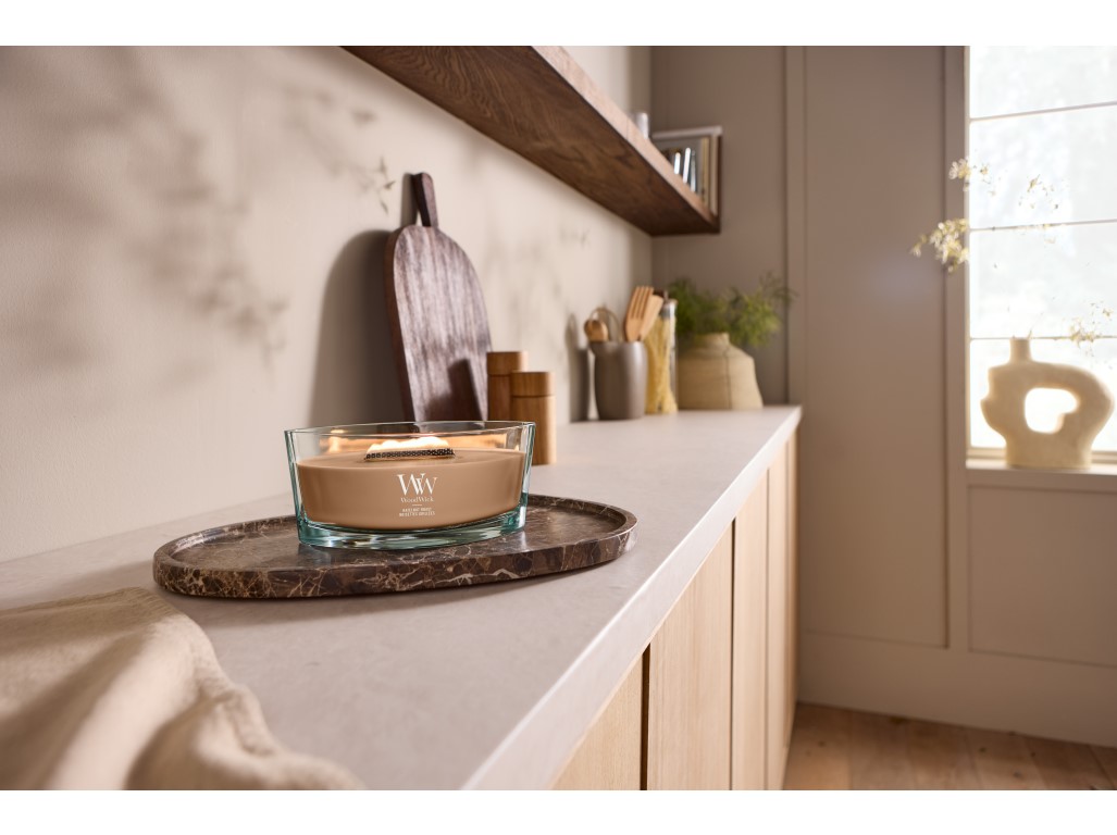 Fedezd fel azokat a pillanatokat, amikor lelassul az idő. A „hajó” forma intenzív illatot és megnyugtató atmoszférát teremt, amely betölti az egész teret. A fa kanóc halkan ropog, a láng finoman táncol, meleget, biztonságot és jóleső otthonosságot ad – mintha a természet egy darabját hoznád haza. A nyitott kialakítás nagyobb illat-tükröt hoz létre, így az aroma egyenletesen oszlik el a nagyobb helyiségekben is. A pasztellszínek és a letisztult üvegdesign harmonikusan kiegészíti a teret, és minden meggyújtás érzékszervi rituálévá válik, a természettel összhangban. TIPP: Mindig hagyd a viaszt a peremig felolvadni, és 3–4 órán át égni.