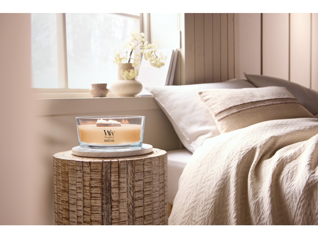 Fedezd fel azokat a pillanatokat, amikor lelassul az idő. A „hajó” forma intenzív illatot és megnyugtató atmoszférát teremt, amely betölti az egész teret. A fa kanóc halkan ropog, a láng finoman táncol, meleget, biztonságot és jóleső otthonosságot ad – mintha a természet egy darabját hoznád haza. A nyitott kialakítás nagyobb illat-tükröt hoz létre, így az aroma egyenletesen oszlik el a nagyobb helyiségekben is. A pasztellszínek és a letisztult üvegdesign harmonikusan kiegészíti a teret, és minden meggyújtás érzékszervi rituálévá válik, a természettel összhangban. TIPP: Mindig hagyd a viaszt a peremig felolvadni, és 3–4 órán át égni.