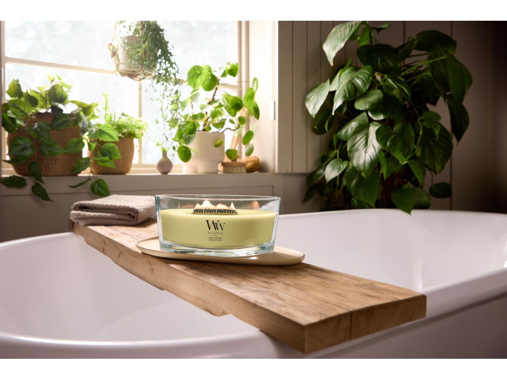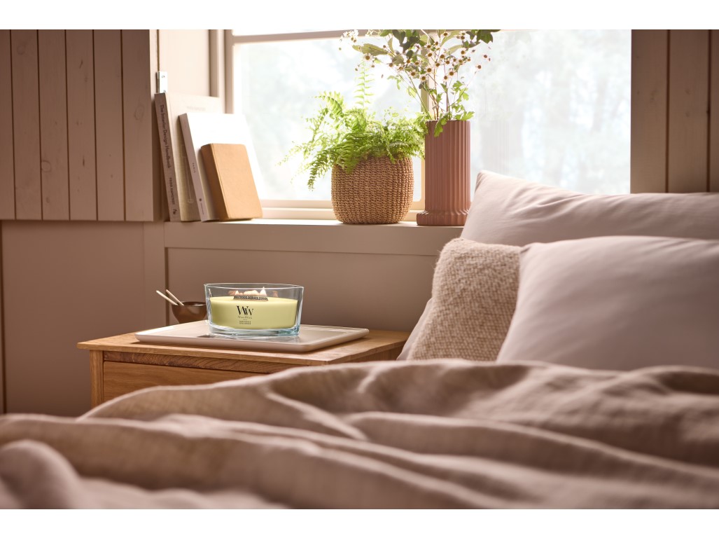 Fedezd fel azokat a pillanatokat, amikor lelassul az idő. A „hajó” forma intenzív illatot és megnyugtató atmoszférát teremt, amely betölti az egész teret. A fa kanóc halkan ropog, a láng finoman táncol, meleget, biztonságot és jóleső otthonosságot ad – mintha a természet egy darabját hoznád haza. A nyitott kialakítás nagyobb illat-tükröt hoz létre, így az aroma egyenletesen oszlik el a nagyobb helyiségekben is. A pasztellszínek és a letisztult üvegdesign harmonikusan kiegészíti a teret, és minden meggyújtás érzékszervi rituálévá válik, a természettel összhangban. TIPP: Mindig hagyd a viaszt a peremig felolvadni, és 3–4 órán át égni.